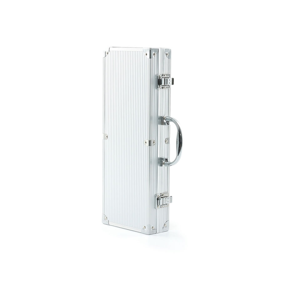 Descrição: Kit churrasco 5 peças em maleta de alumínio com travas de segurança, contém três facas de corte, tesoura e chaira. Parte interna da maleta com revestimento em tnt e suportes de velcro para fixação das peças.